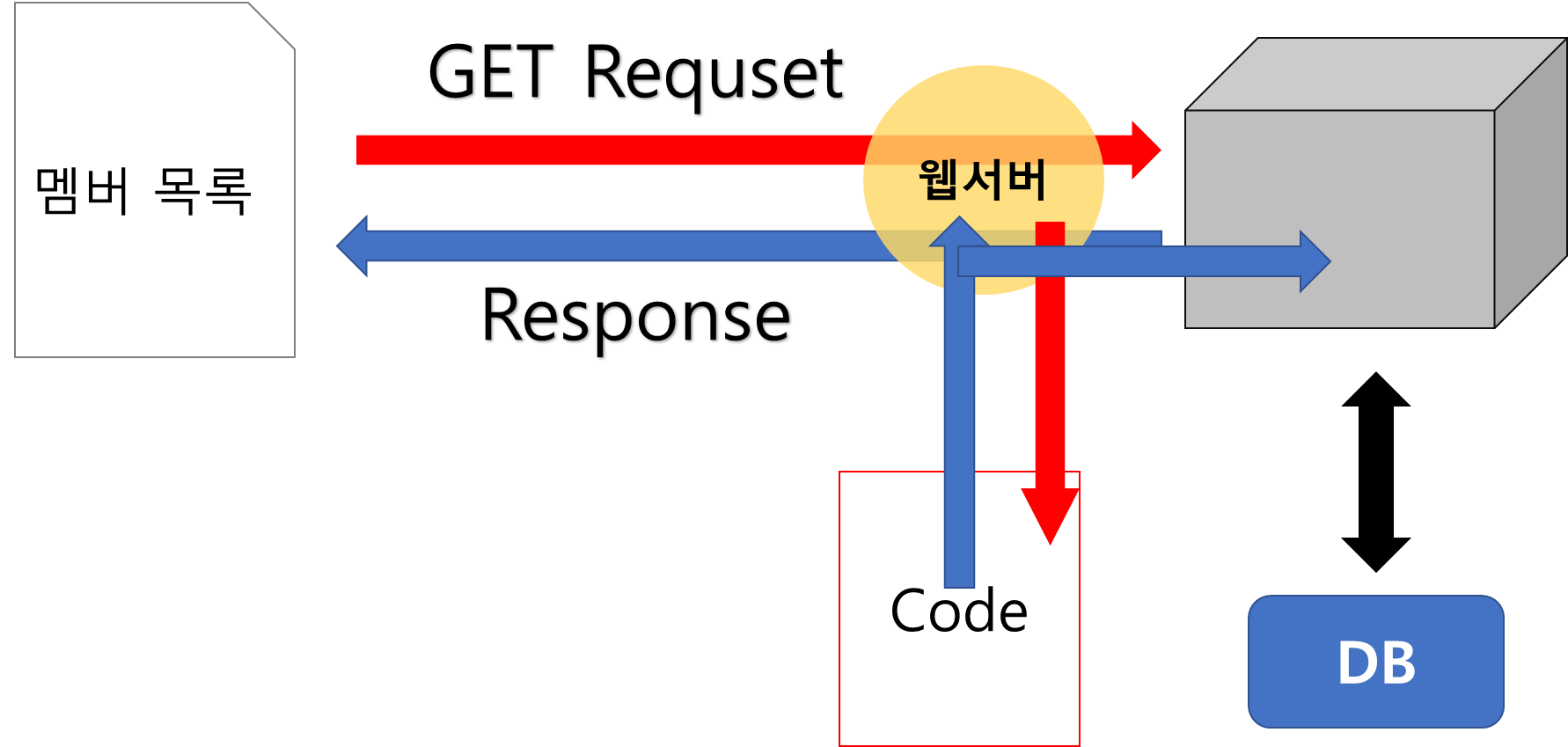- 웹서버는 코드를 실행해서 디비에서 목록을 문서화해서 돌려준다.