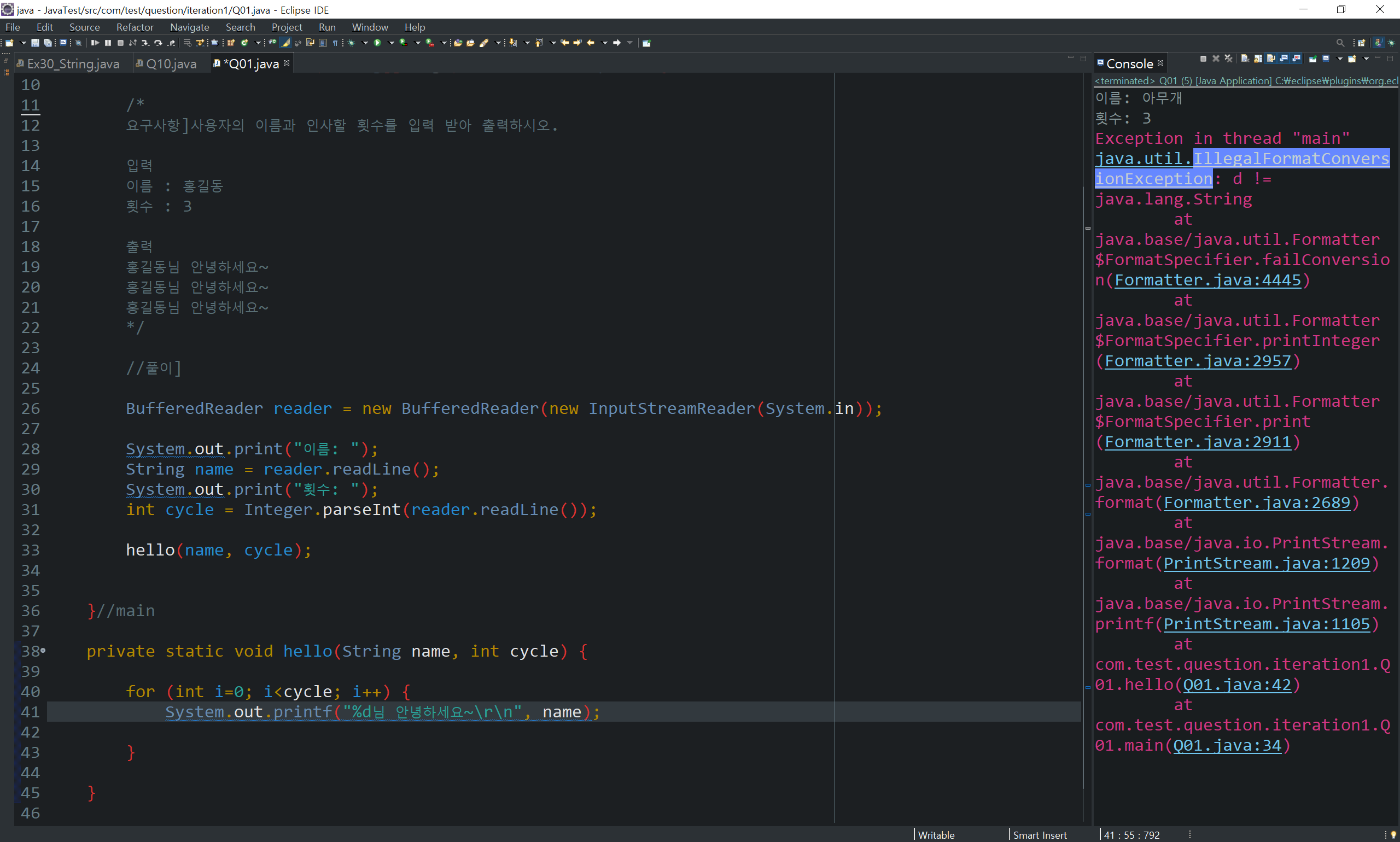 d는 String이 아니다. 즉 41라인에서 출력을 하던 중 %s로 기입해야하는것을 %d로 잘못기입해서 일어난 에러