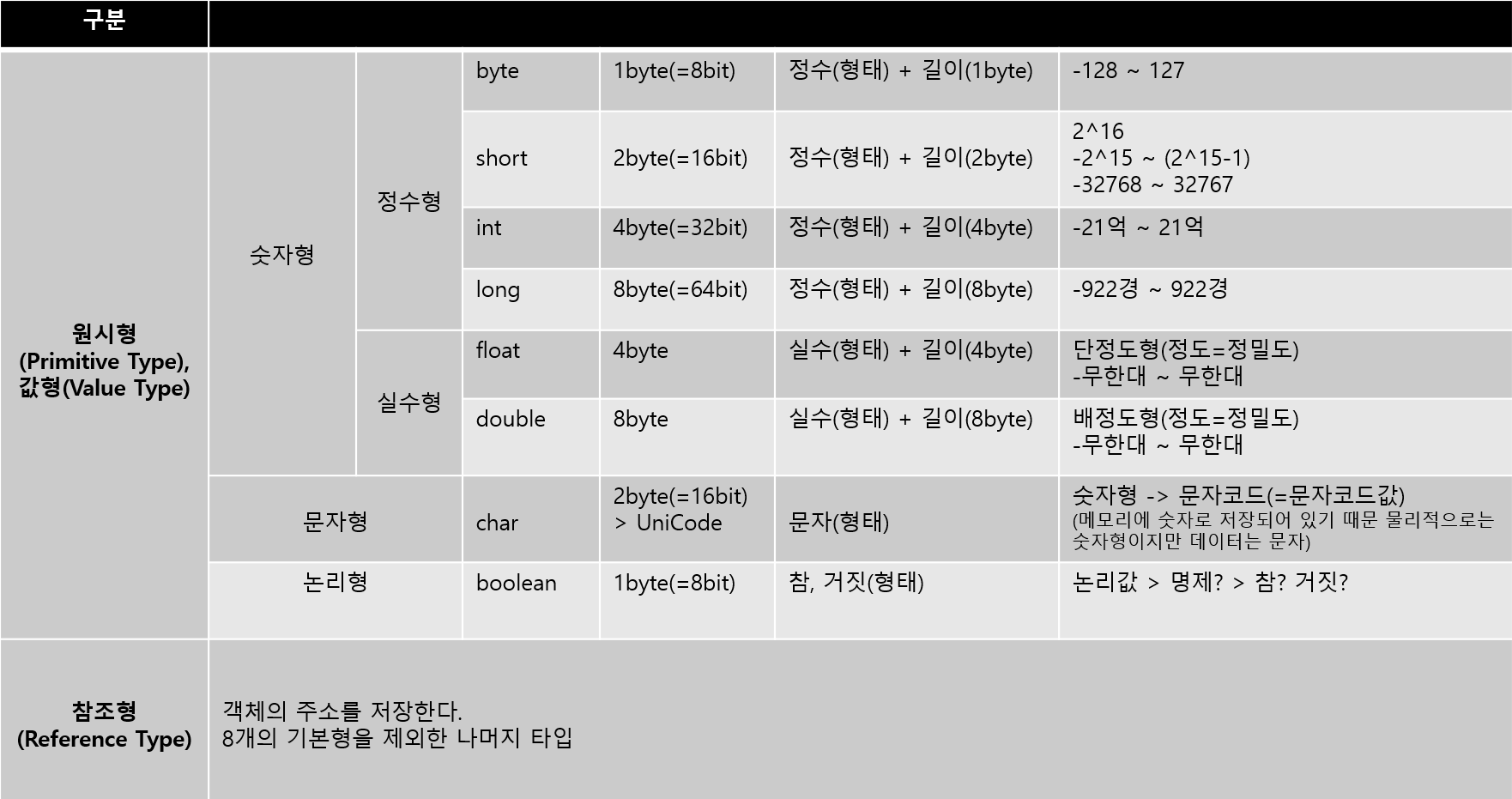 - boolean을 제외한 나머지 7개의 기본형은 서로 연산과 변환이 가능