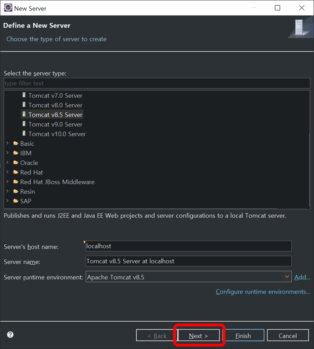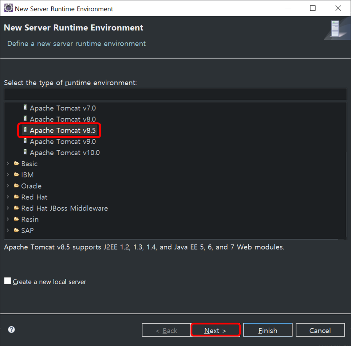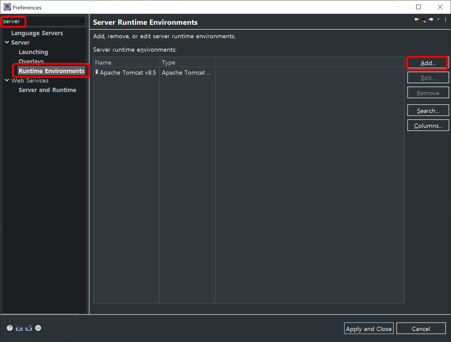 그 후 검색창에 server 검색 후 Runtime Environments를 클릭하면 이런 화면이 보인다.
