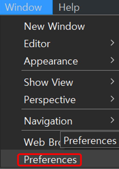먼저, 왼쪽 상단의 Window -> preferences 클릭