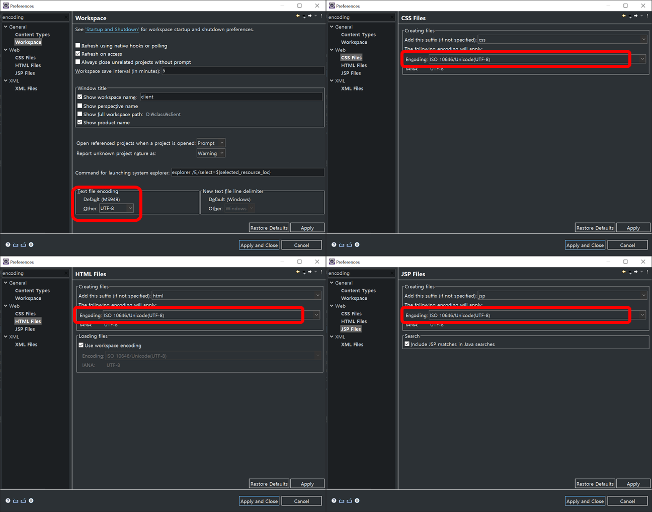 windows → Preferences → encoding → 전부 UTF-8 변경